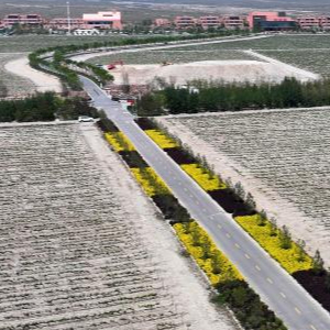 在位于宁夏银川市贺兰山东麓的海悦仁和酒庄,工人在为葡萄藤抹芽、剪枝(无人机照片,5月9日摄)。