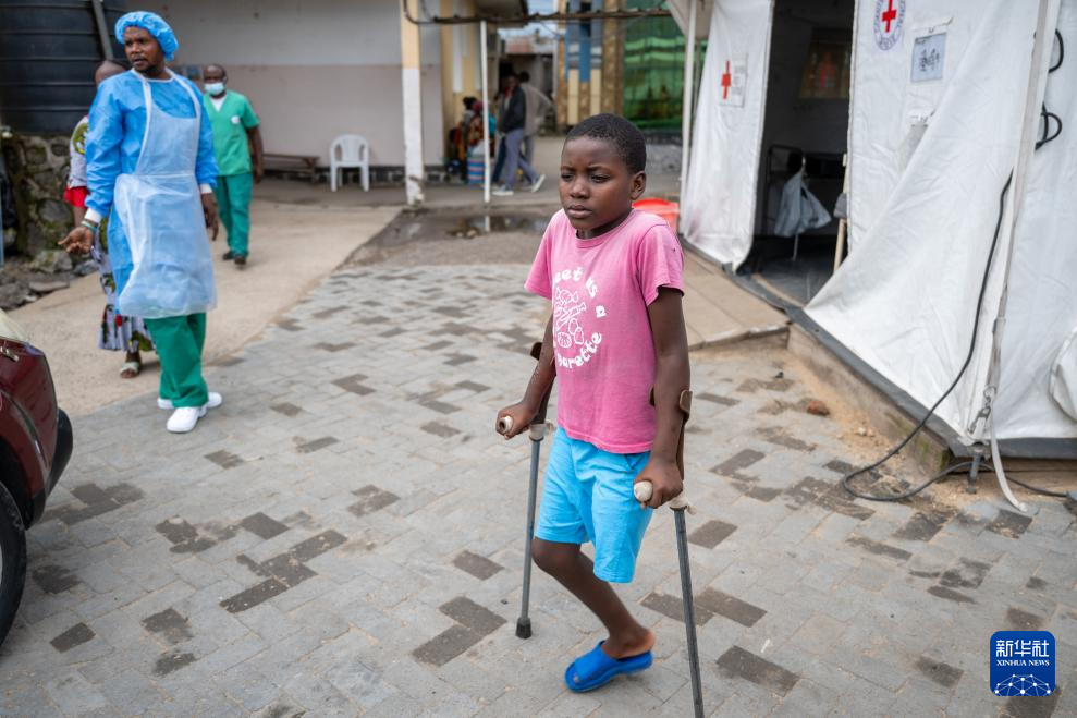 5月10日,一名在刚果(金)东部冲突中失去左腿的儿童走在刚果(金)戈马市恩多绍医院内。