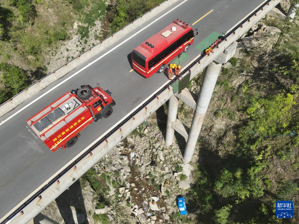 5月12日,在雅安市石棉县举行的四川省2025年抗震救灾演练中,四川省森林消防总队特勤大队二中队消防员对“坠崖人员”进行搜救(无人机照片)。