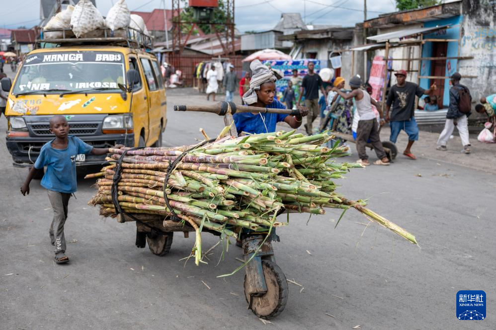 5月11日,在刚果(金)东部小镇萨凯的一处市集,当地居民使用传统手推车运送甘蔗。
