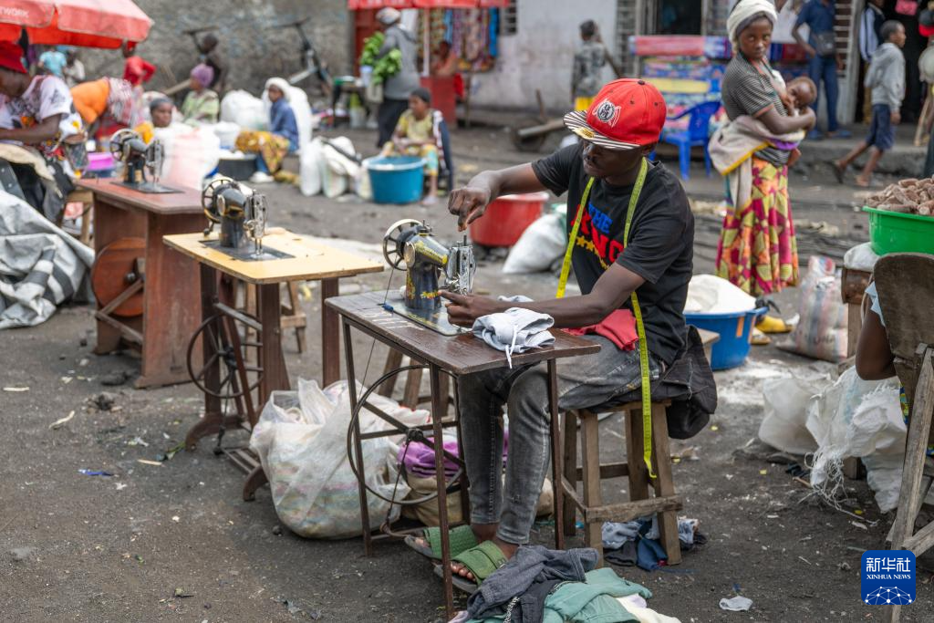 5月11日,在刚果(金)东部小镇萨凯的一处市集,一名男子使用缝纫机为顾客缝补衣物。