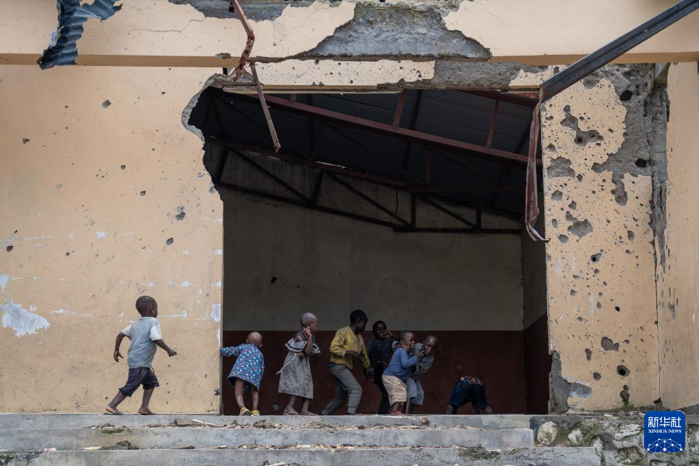 5月11日,在刚果(金)东部小镇萨凯,孩子们在一处因冲突损毁的房屋旁玩耍。