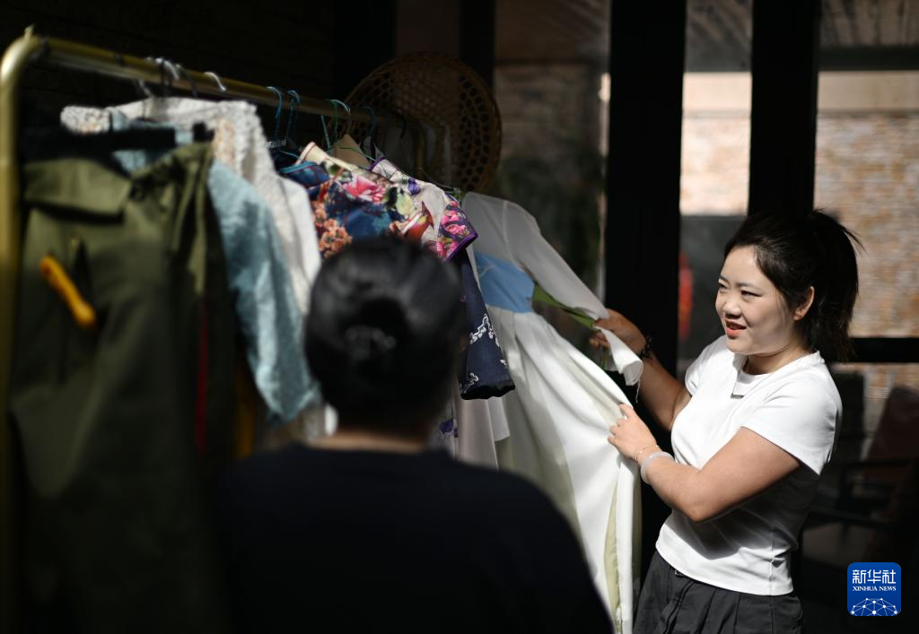 5月10日,在天津市蓟州区映像磐山古装摄影主题民宿,王若男(右)向客人推荐古装款式。