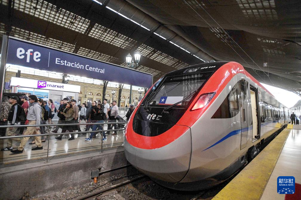 2024年1月19日,在智利圣地亚哥中央车站,中车四方研制的电力内燃双动力动车组等待发车。