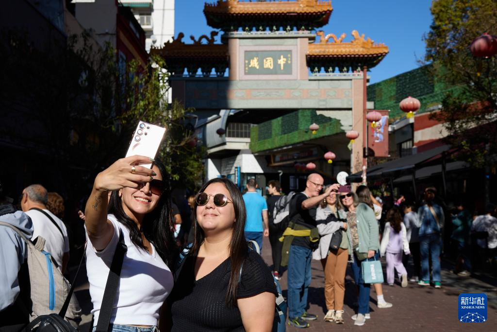 2025年5月10日,市民在阿根廷布宜诺斯艾利斯的“中国城”牌坊前自拍。
