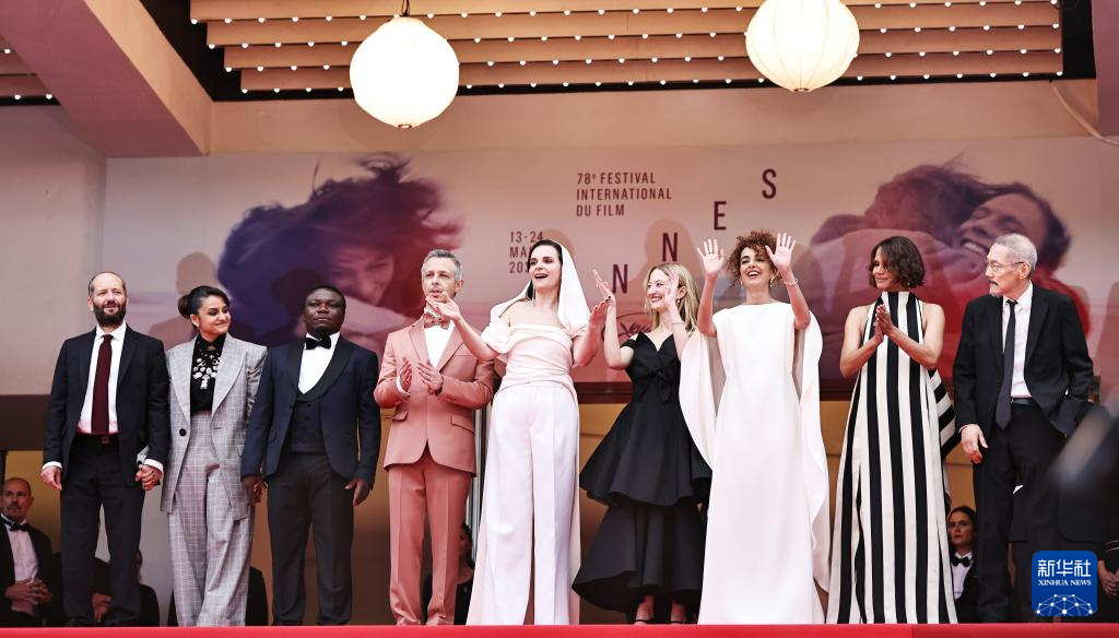 5月13日,在法国戛纳举行的第78届戛纳国际电影节上,法国导演阿梅莉·博南(左五)携开幕影片《启程之日》主创人员亮相开幕式红毯。