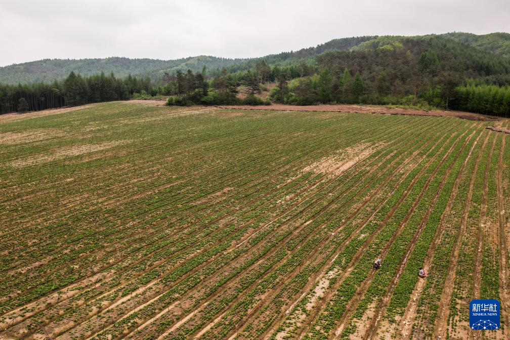 5月14日,在辽宁省抚顺市新宾满族自治县,一家生产辽细辛企业的工作人员在种植基地进行日常维护工作(无人机照片)。