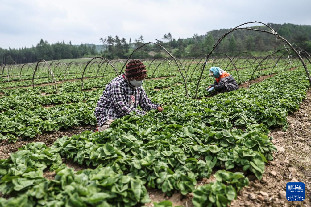 5月14日,在辽宁省抚顺市新宾满族自治县,一家生产辽细辛企业的工作人员在种植基地进行日常维护工作。