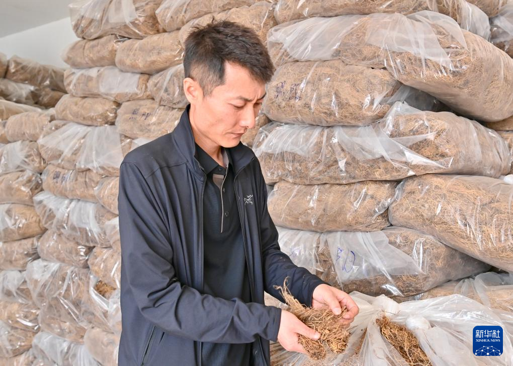 5月14日,在辽宁省抚顺市新宾满族自治县,辰轩中药材经营有限公司负责人在仓库里检查辽细辛品质。