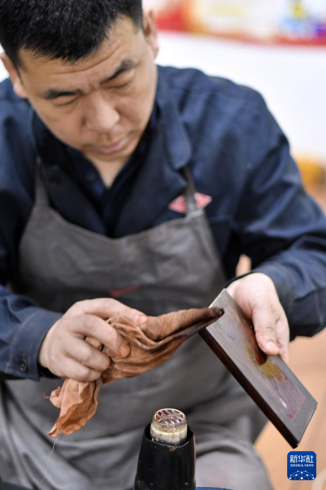 5月7日,北京龙顺成中式家具有限公司生产基地的技师在用传统技艺为不使用油漆的硬木家具烫蜡。