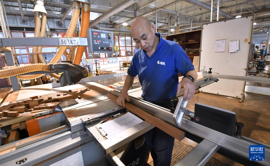 5月7日,北京龙顺成中式家具有限公司生产基地的技师在切割硬木家具制作用的木材。