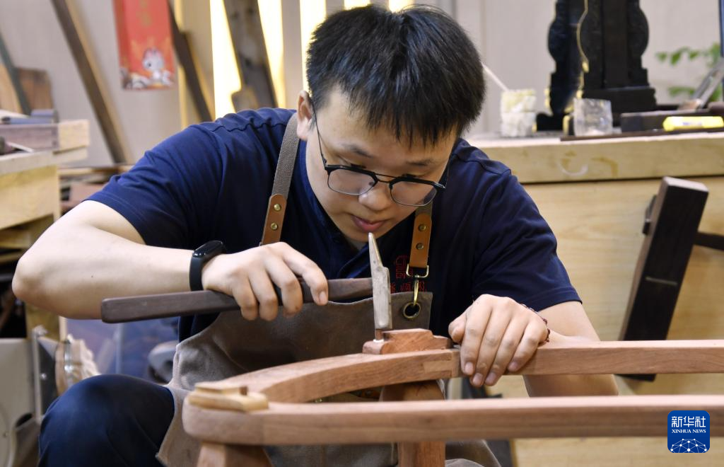 5月13日,北京龙顺成中式家具有限公司古旧家具修复中心的青年技师在复制古旧家具。