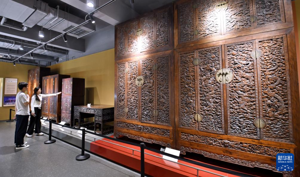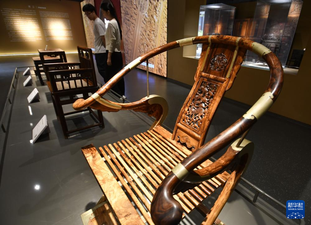 5月13日,游人在参观北京龙顺成京作非遗博物馆内展出的明、清时期的硬木家具。