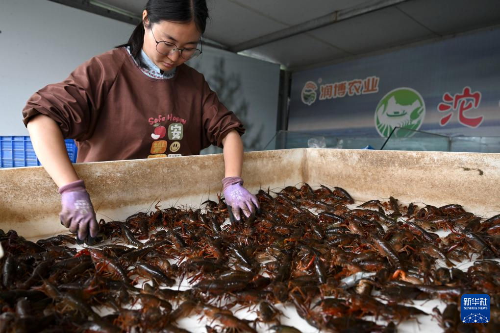 5月15日,在蚌埠市五河县沱湖乡大岗村,工作人员在分拣小龙虾。