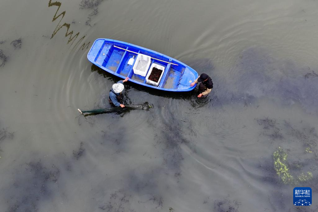 5月15日,在蚌埠市五河县沱湖乡大岗村,工作人员在捕捞小龙虾(无人机照片)。