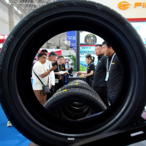 5月15日,人们在第十五届中国(广饶)国际橡胶轮胎暨汽车配件展览会上参观。