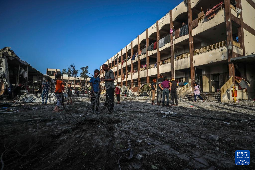 5月14日,在加沙地带北部杰巴利耶地区,巴勒斯坦人查看被以军轰炸后的废墟。