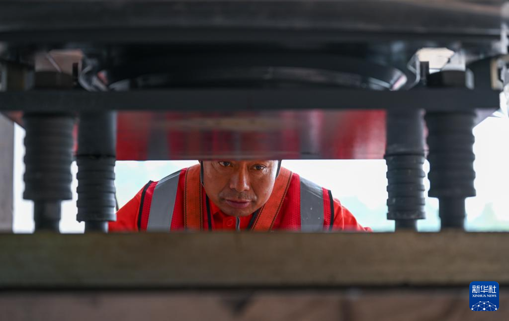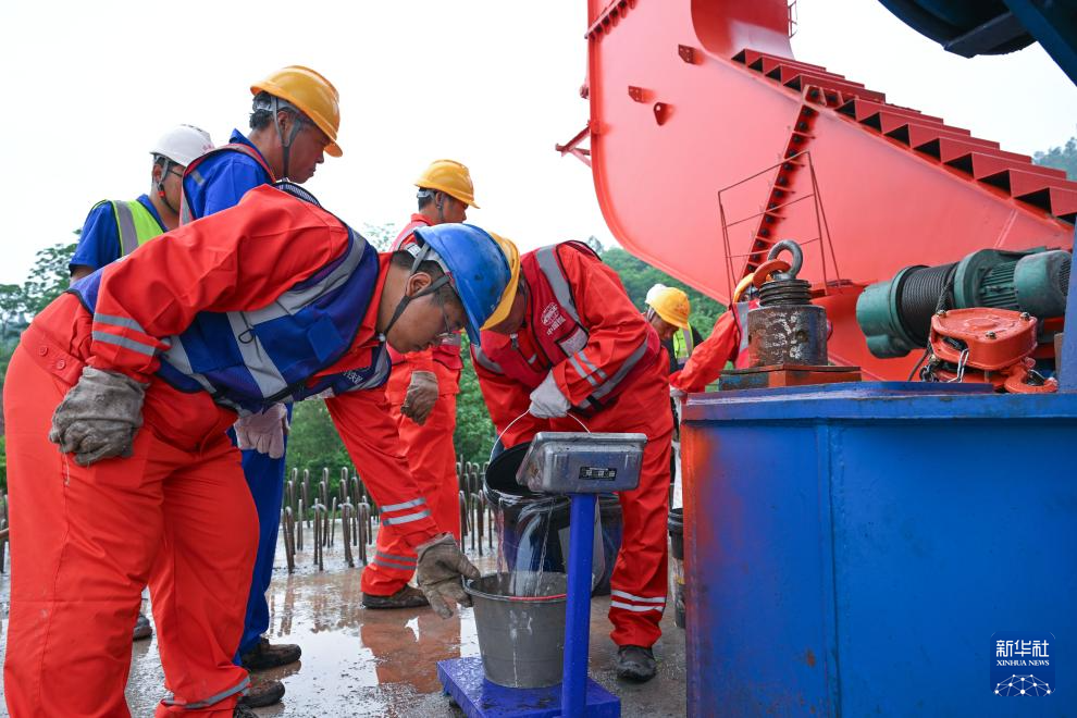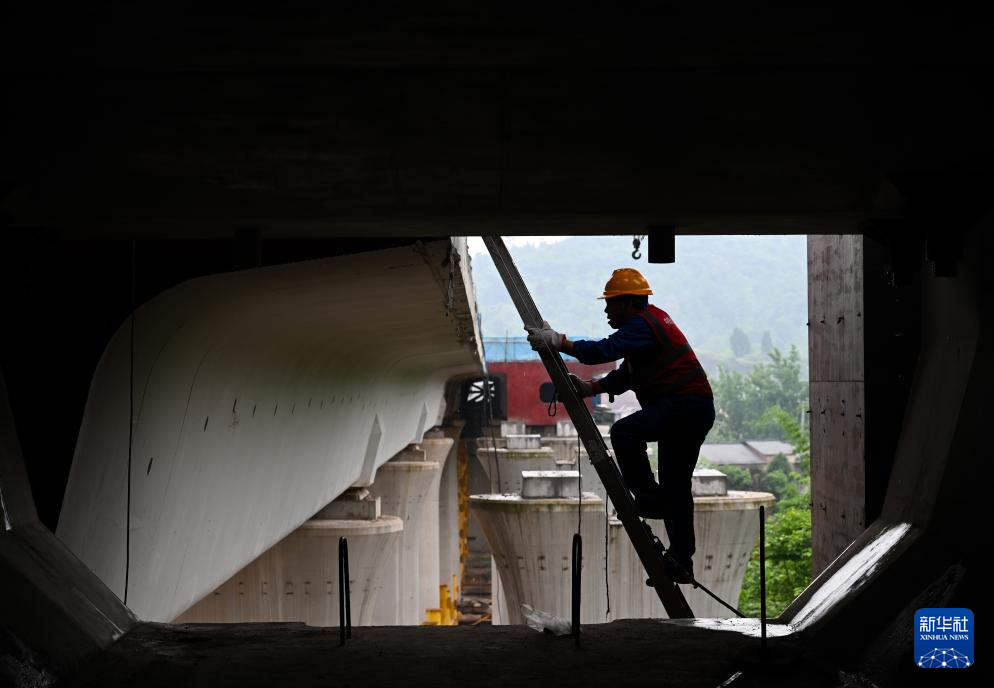 5月16日,重庆市大足区,工作人员在大足石刻站四线道岔特大桥首片双线箱梁的施工现场作业。