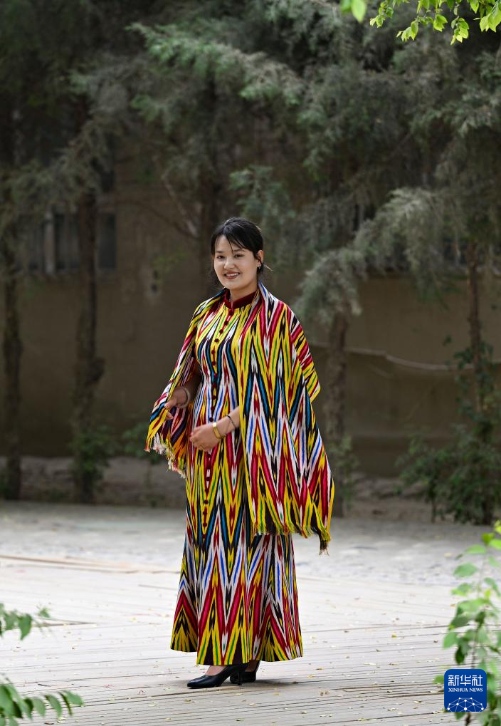 5月14日,在和田吉亚乡,热萨莱提·阿卜杜吉力力展示艾德莱斯绸做成的服饰。她目前在吉亚乡从事艾德莱斯绸推广工作,向慕名而来的游客介绍艾德莱斯绸织染技艺。