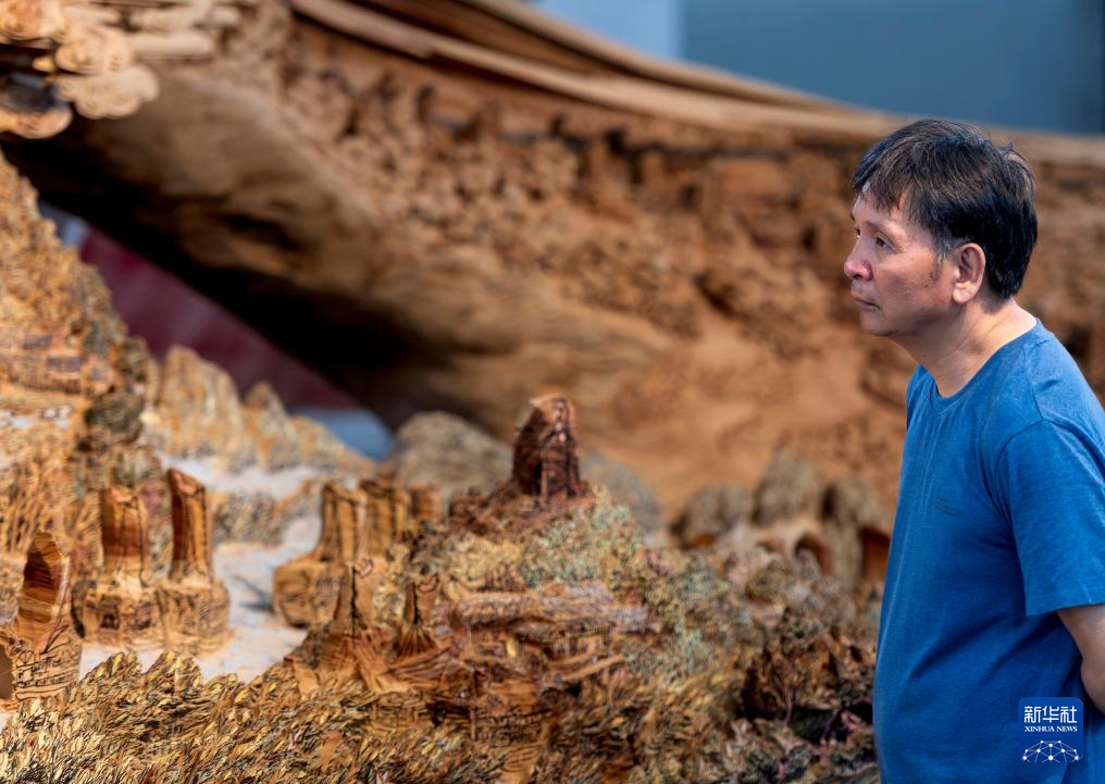 在莆田美术馆,郑春辉在构思百米巨型木雕作品《京杭大运河》的下一步雕刻工序(5月16日摄)。