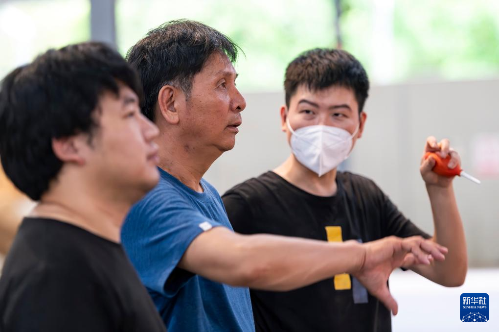 在莆田美术馆,郑春辉(左)在教授徒弟雕刻技巧(5月16日摄)。