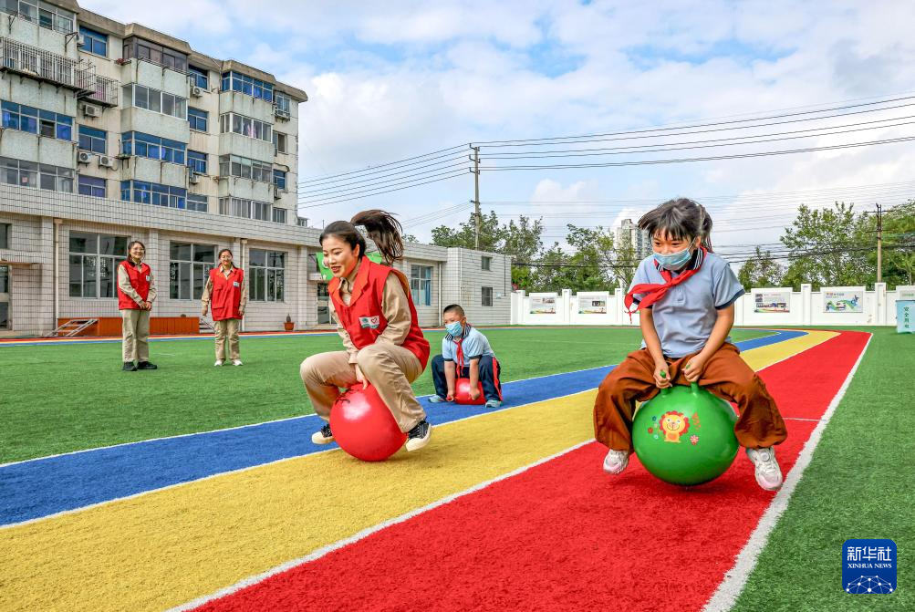 5月16日,在江苏省扬州市江都区特殊教育学校,青年志愿者和智力障碍学生一起做“羊角球”蹦蹦跳游戏。