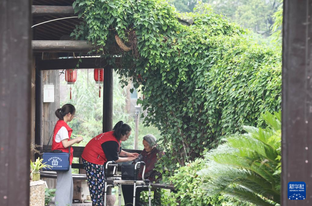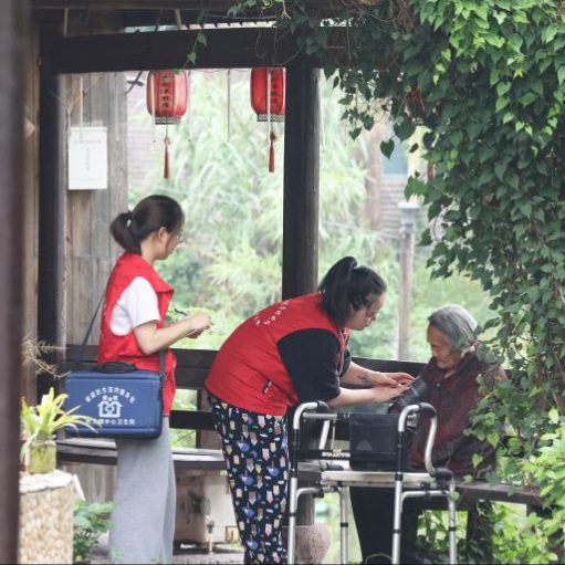 5月16日,在浙江省湖州市德清县乾元镇金火村,镇中心卫生院的家庭医生上门为残疾群众提供免费健康检查。