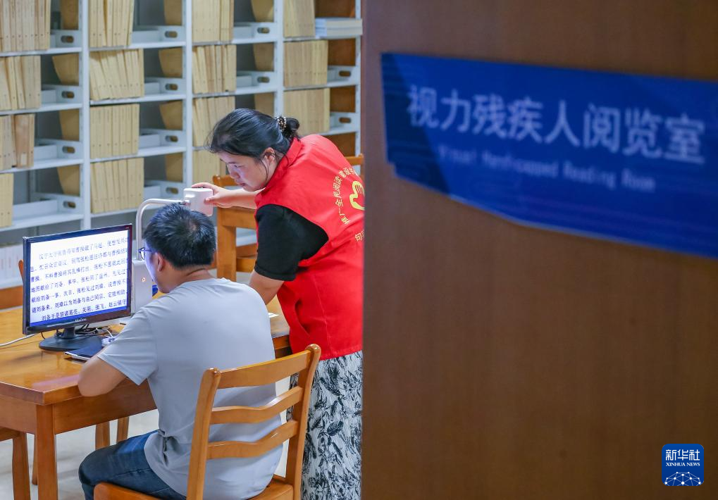 5月17日,在江苏省句容市图书馆视力残疾人阅览室,志愿者(右)帮助视障人士调试台式助视器。