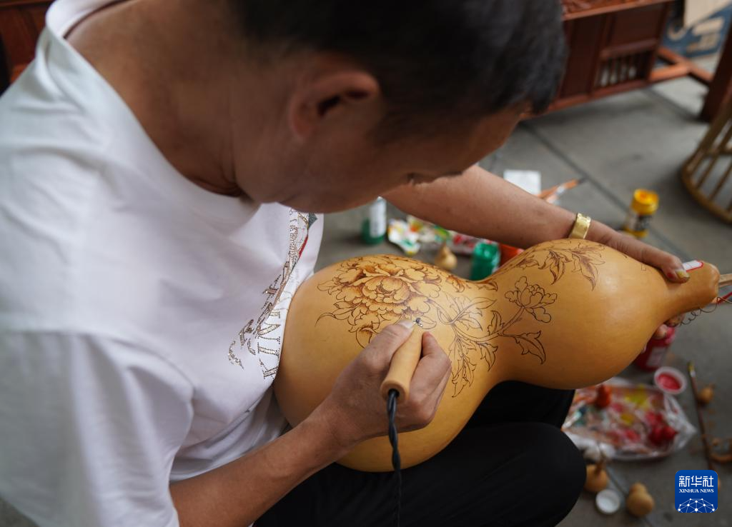 5月16日,残障人士在云南省临沧市临翔区市民活动广场残疾人创业产品展示展销现场绘制葫芦。