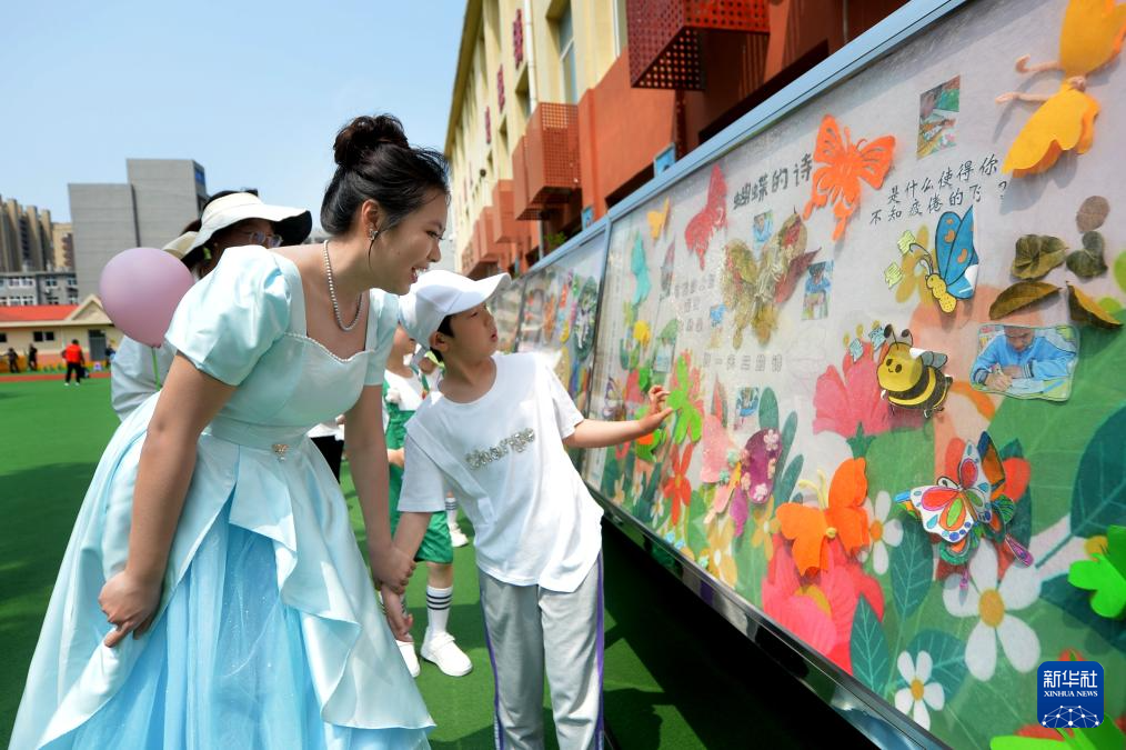 5月16日,在山东省青岛市市北区的特殊教育学校——仁爱学校开展的“传递爱的温暖 点亮生命之光”助残日主题活动中,志愿者和孩子们一起参观“心灵小画布”画展。