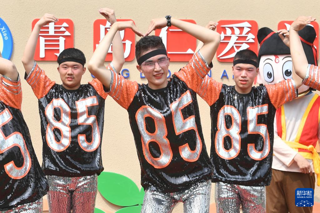 5月16日,在山东省青岛市市北区的特殊教育学校——仁爱学校开展的“传递爱的温暖 点亮生命之光”助残日主题活动中,孩子们在进行舞蹈表演。