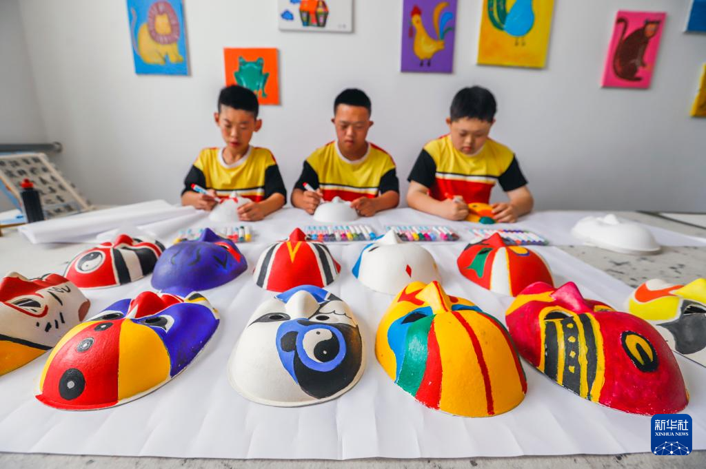 5月15日,河北省遵化市特殊教育学校的学生在美术室为脸谱着色。
