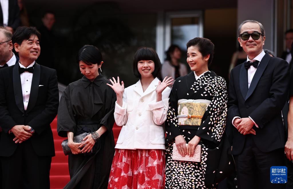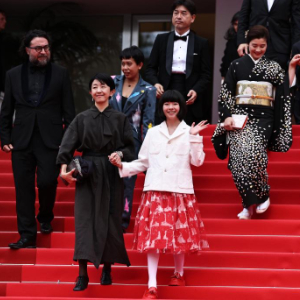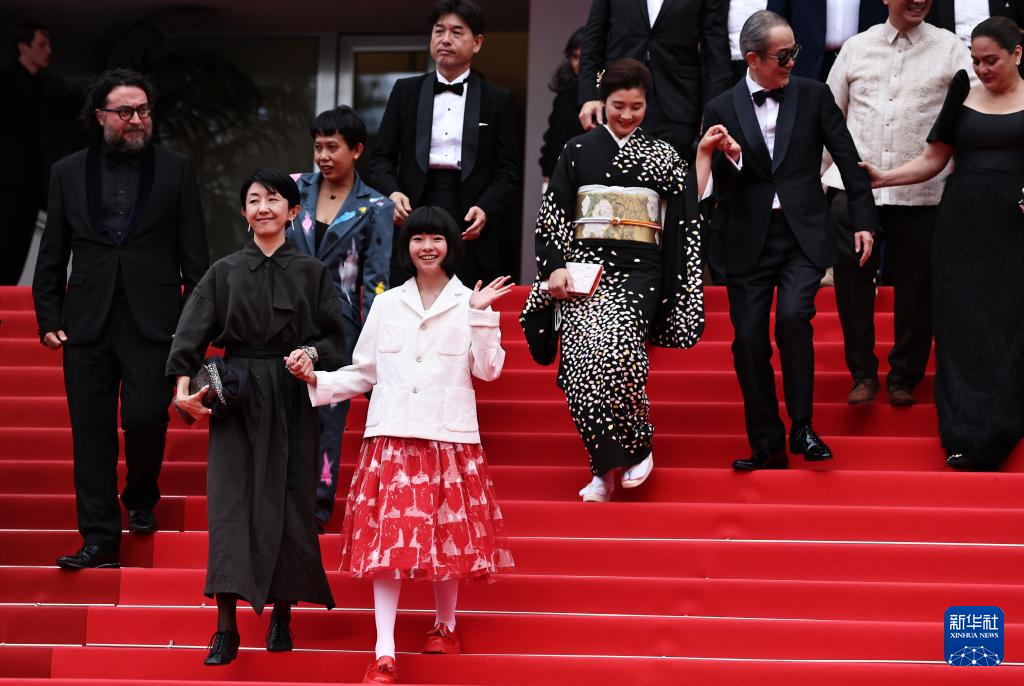 5月17日,在法国戛纳举行的第78届戛纳国际电影节上,主竞赛单元影片《雷诺阿》导演早川千绘(前左)和主演铃木唯(前右)在影片首映后走出电影宫。