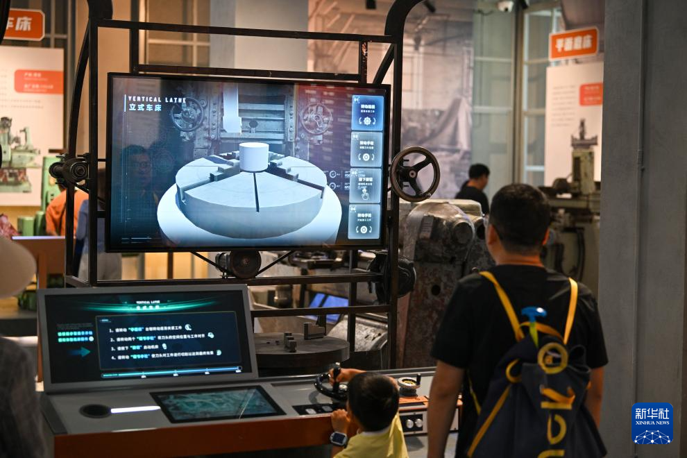 5月18日,游客在天津机床工业博物馆体验互动机床设备。