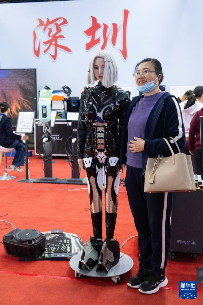 5月18日,在哈洽会深圳展区,与会者与人形机器人合影。
