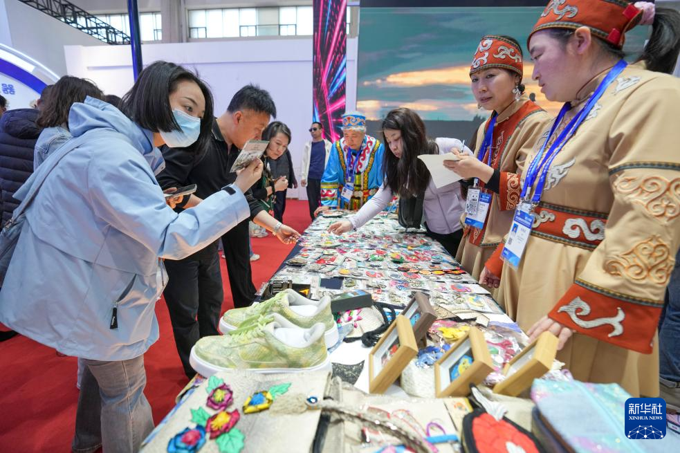 5月18日,在哈洽会佳木斯同江展区,人们在了解赫哲族鱼皮工艺品。