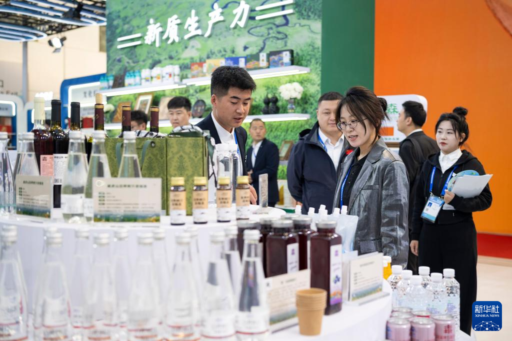 5月18日,在哈洽会龙江森工集团展区,与会者选购森林饮料。