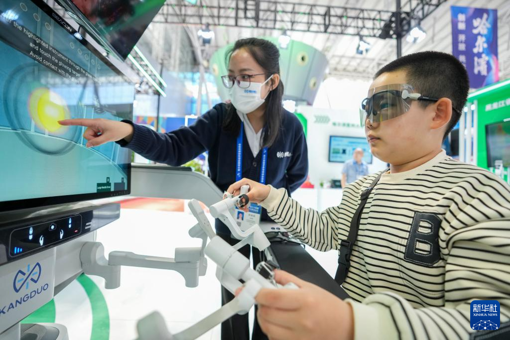 5月18日,在哈洽会数字经济展区,小朋友在体验操控一款医疗机器人进行“手术”。