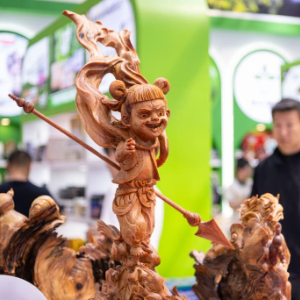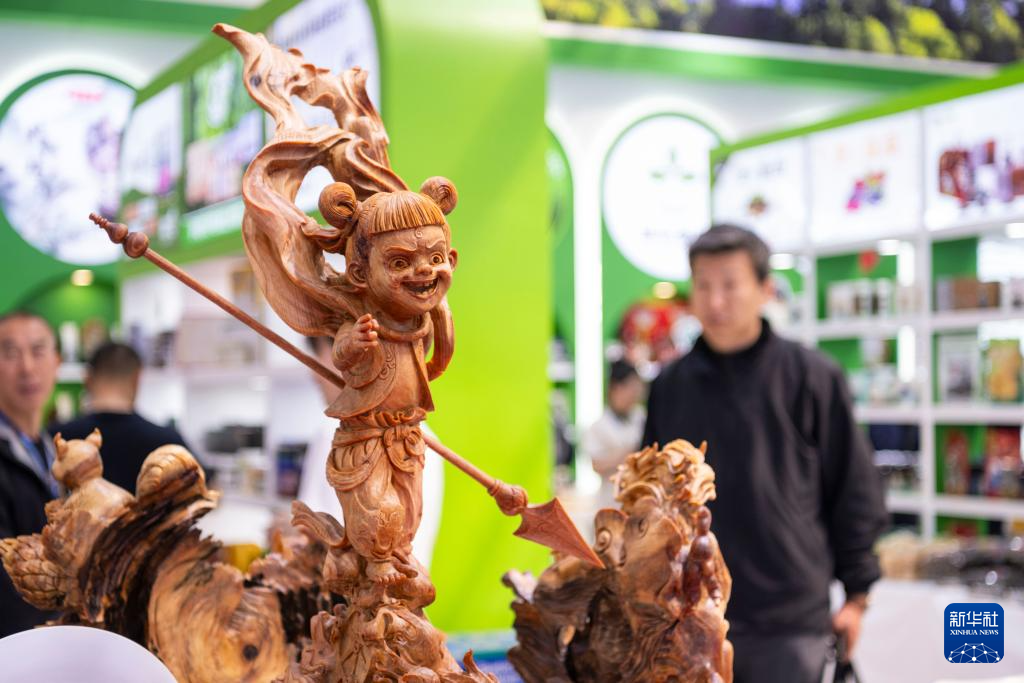 5月18日,在哈洽会伊春展区,与会者在参观哪吒主题木雕。