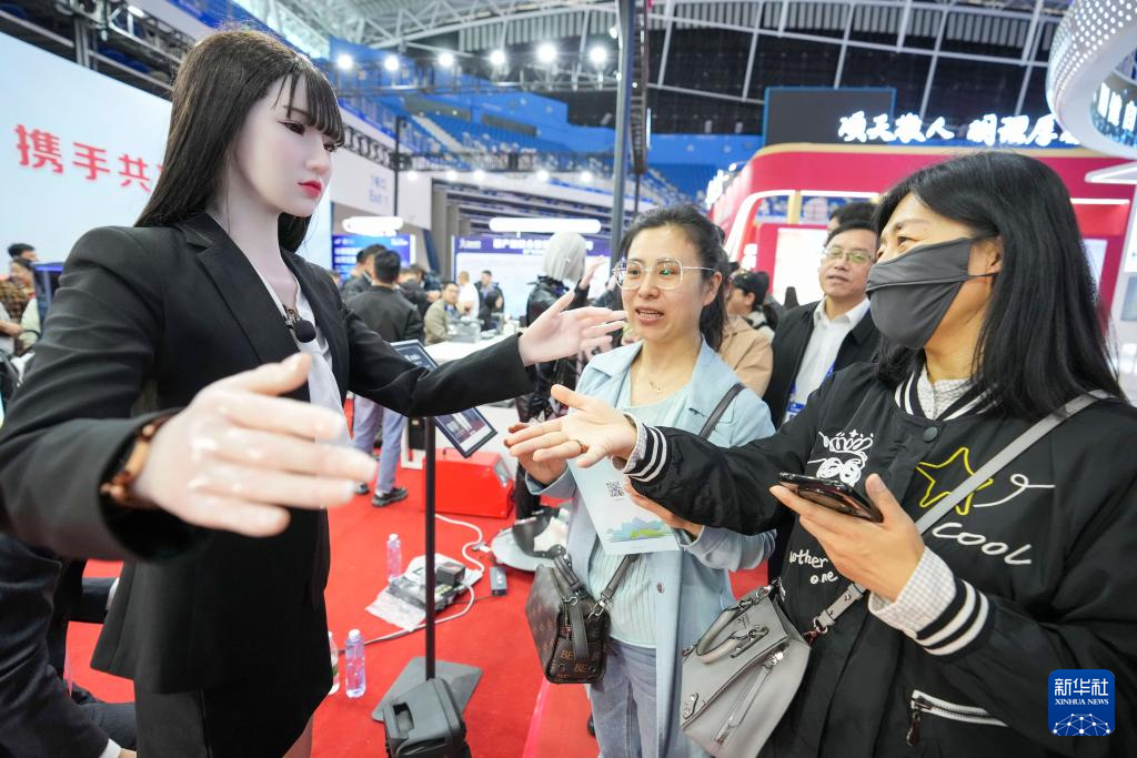 5月18日,在哈洽会深圳展区,人们在与一款人形机器人互动。