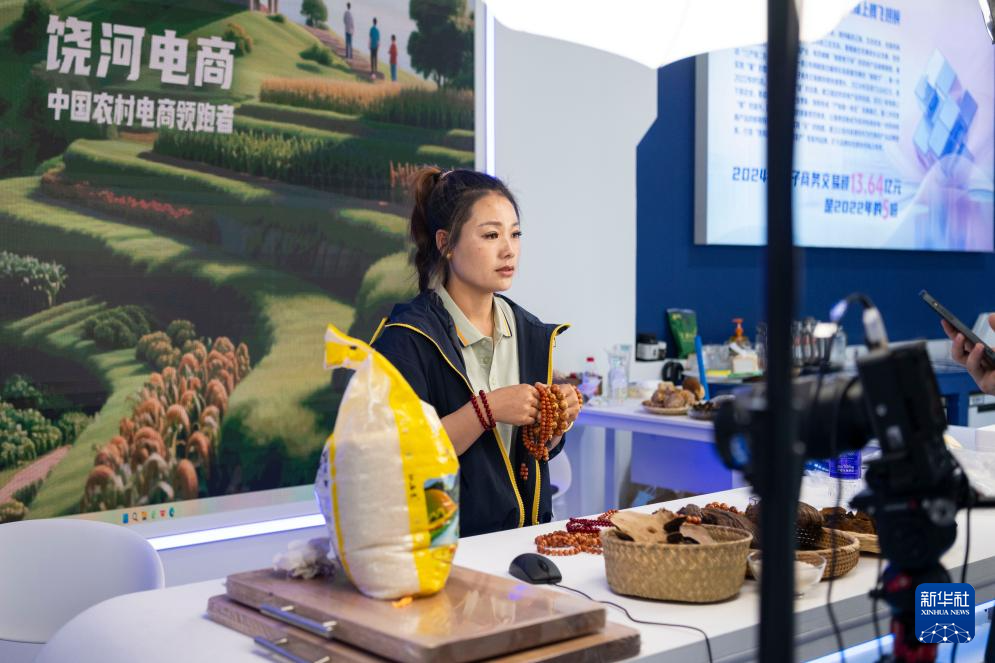5月18日,在哈洽会双鸭山饶河展区,一名主播在推介当地工艺品。