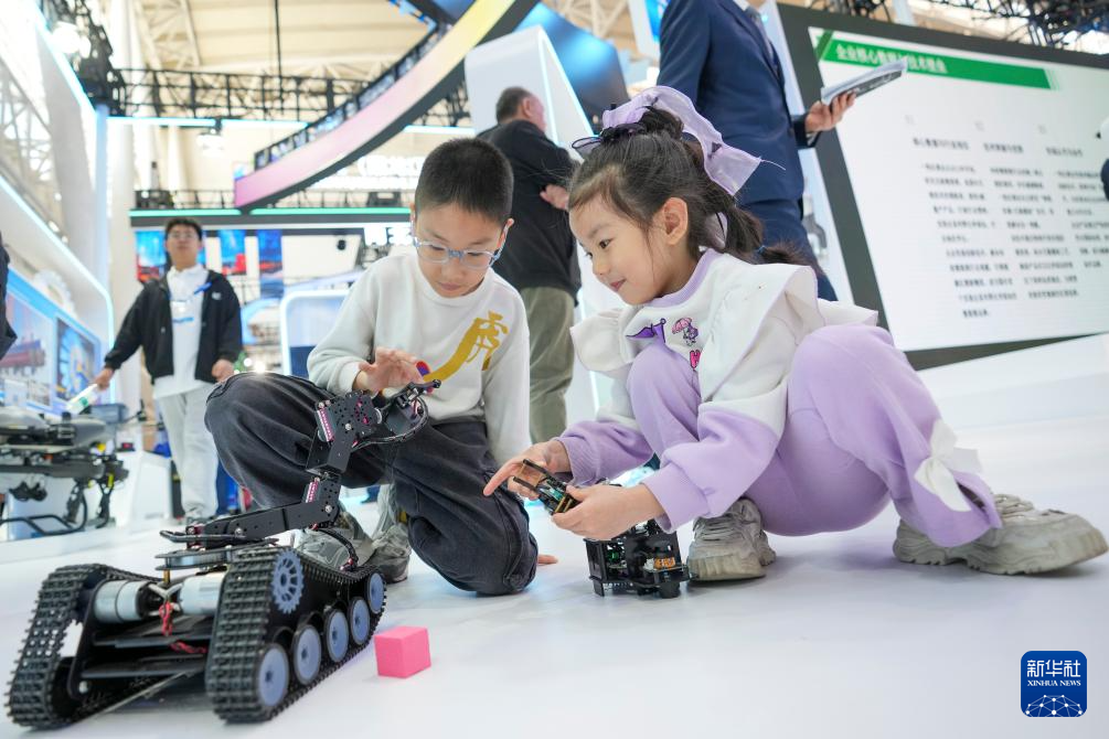 5月18日,在哈洽会哈尔滨展区,小朋友在体验操控一款车型机器人。
