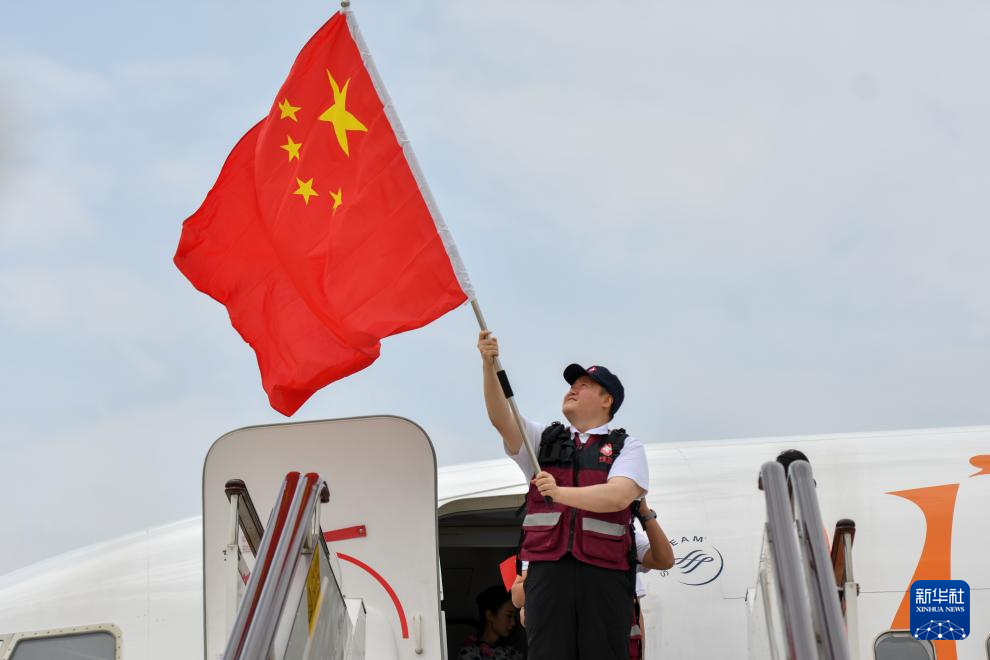 5月18日,中国政府援缅卫生防疫队队员抵达昆明长水国际机场后,在舱门前挥舞国旗。