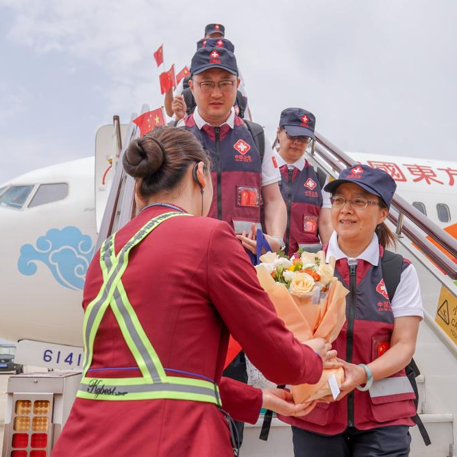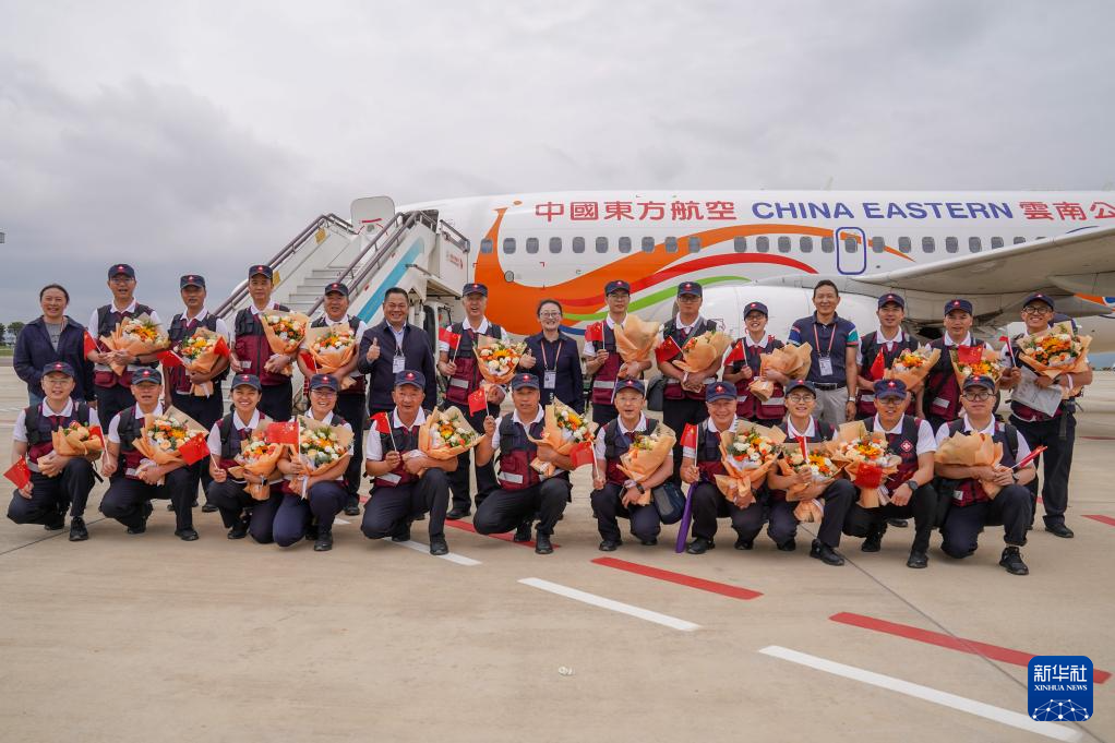 5月18日,工作人员在昆明长水国际机场为中国政府援缅卫生防疫队队员献花。