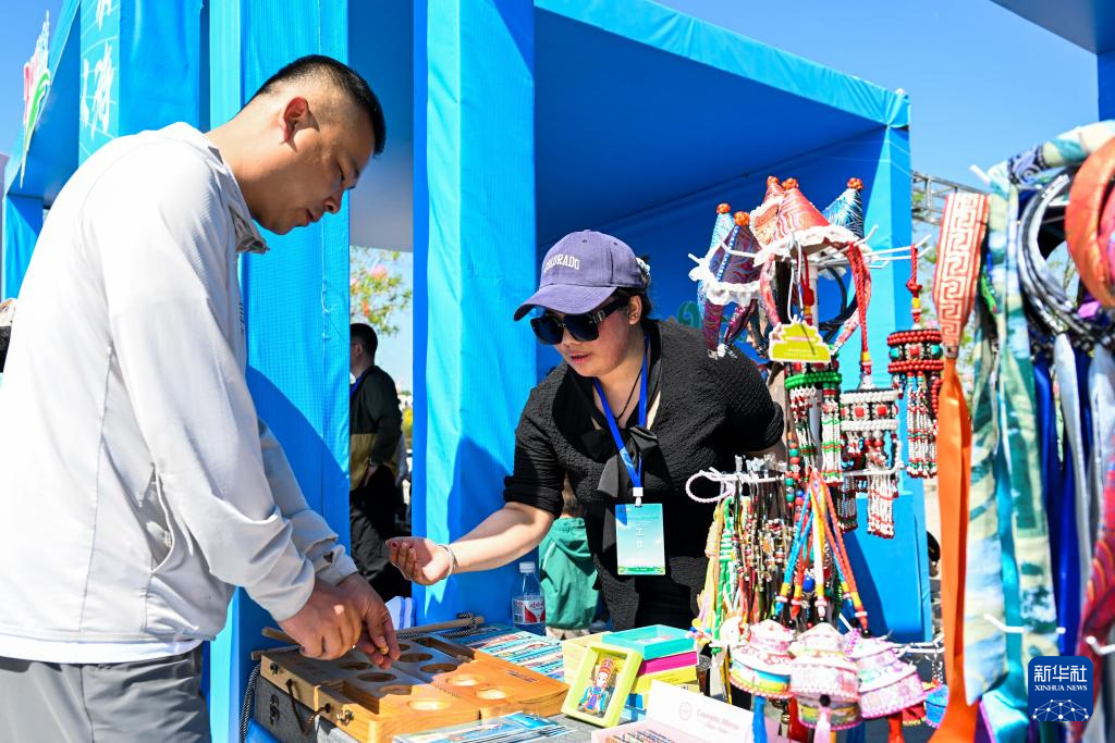 5月19日,在2025年“5·19中国旅游日”内蒙古自治区分会场,工作人员(右)为游客介绍文创产品。