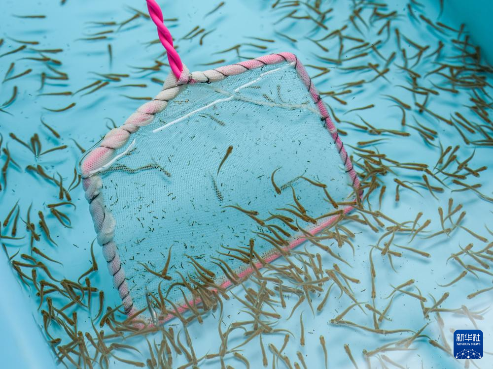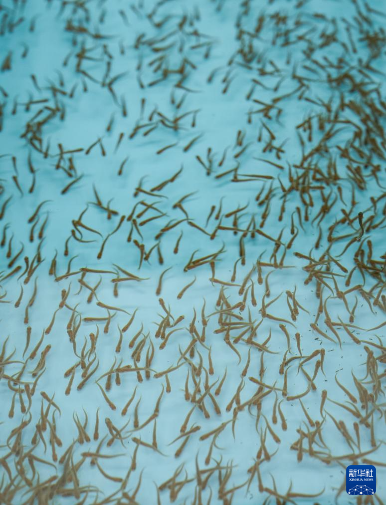 5月18日,川陕哲罗鲑子二代鱼苗正在摄食。