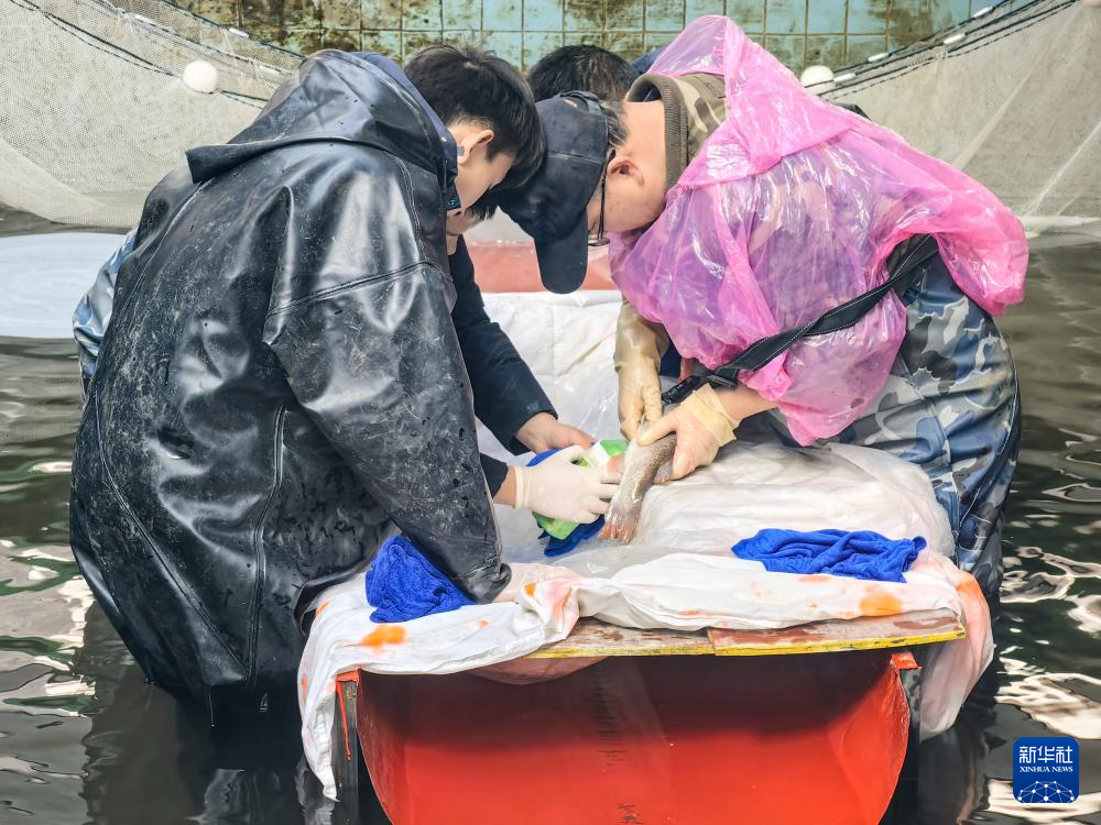 科研人员在采集川陕哲罗鲑子一代雄鱼的精液(3月2日摄)。