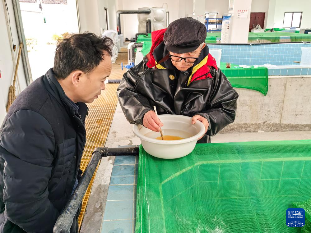 科研人员在挑拣川陕哲罗鲑子二代受精卵(3月2日摄)。