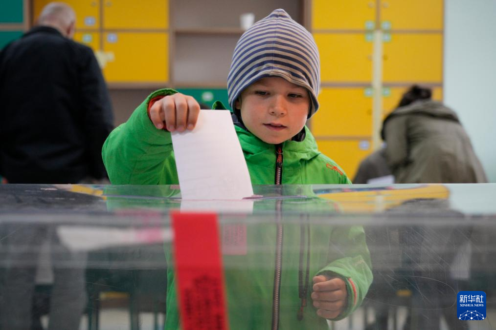5月18日,在波兰首都华沙,一名男孩替他的家长把选票投进选票箱。