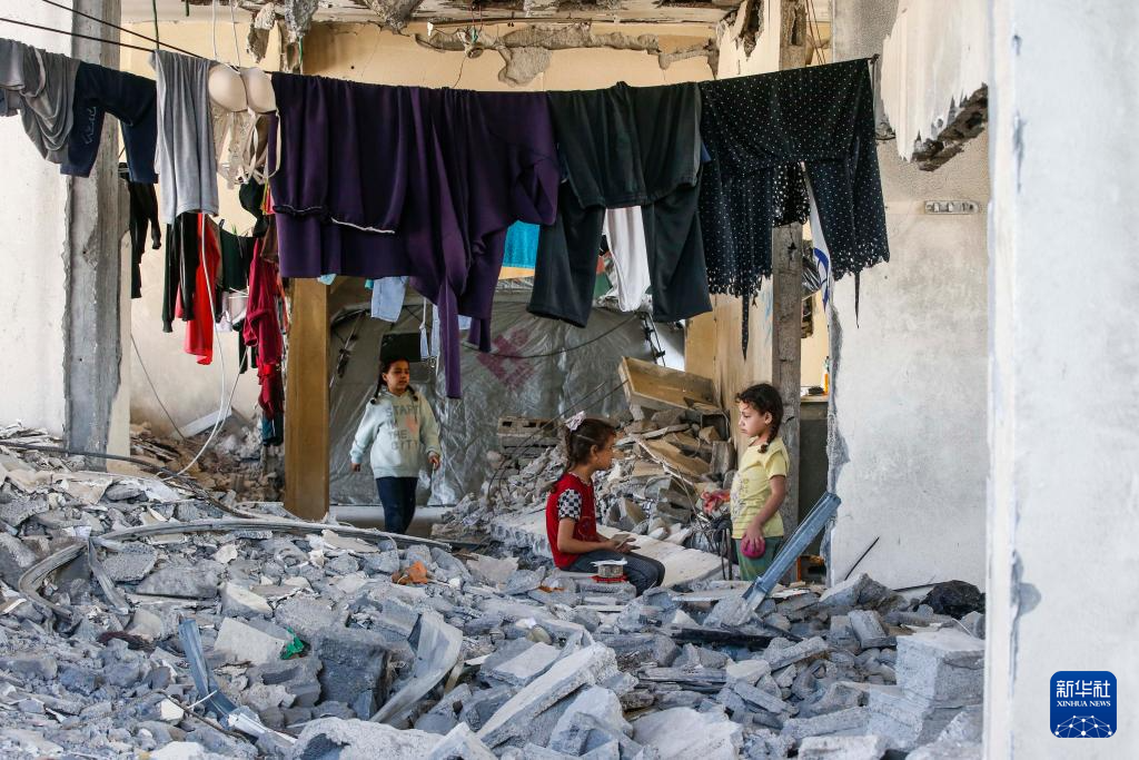 5月20日,在加沙地带北部的杰巴利耶难民营,巴勒斯坦女童在废墟里玩耍。